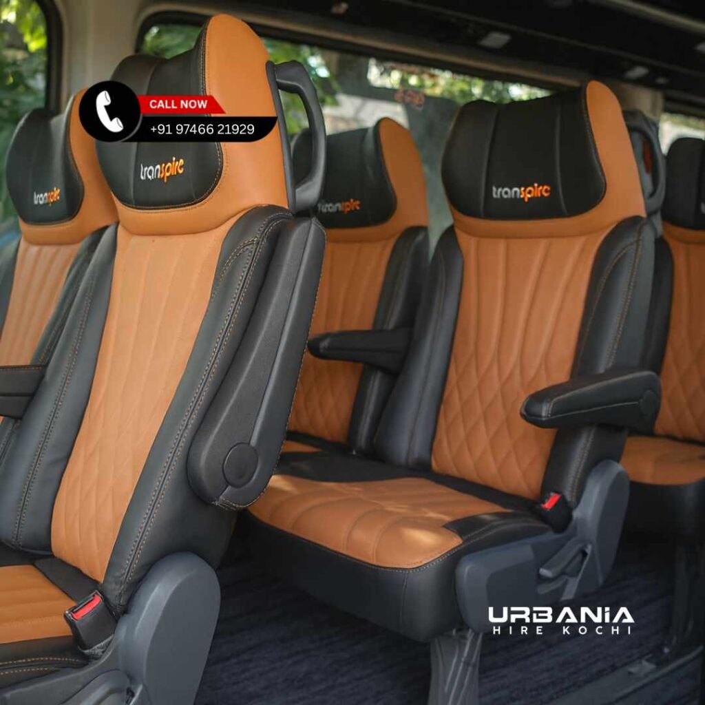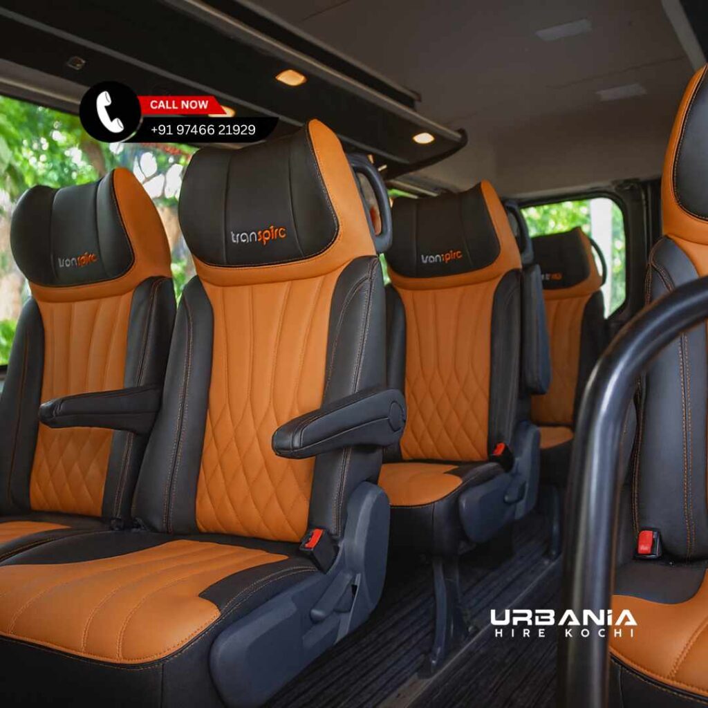 One of the biggest reasons people choose Premium Force Urbania Hire Kochi is the interior experience. Unlike standard tempo travellers, Urbania offers a refined cabin that feels closer to a luxury coach.
